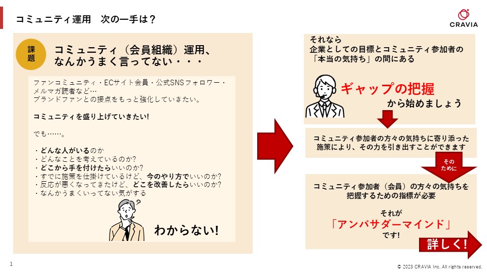 コミュニティ(会員組織)戦略診断 企業とコミュニティ参加者の「本当の気持ち」の間にあるギャップを把握 アンバサダープログラムに関するお問い合わせ 資料請求 お問い合わせ ファンマーケティングのトピックスをnoteで更新中! Page top