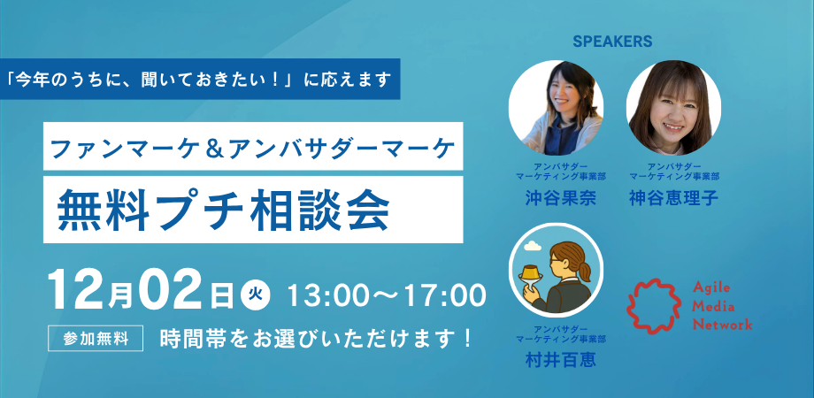 沖谷 果奈(アジャイルメディア・ネットワーク株式会社 アンバサダーマーケティング事業部) 神谷 恵理子(アジャイルメディア・ネットワーク株式会社 アンバサダーマーケティング事業部) 村井 百恵(アジャイルメディア・ネットワーク株式会社 アンバサダーマーケティング事業部) |
